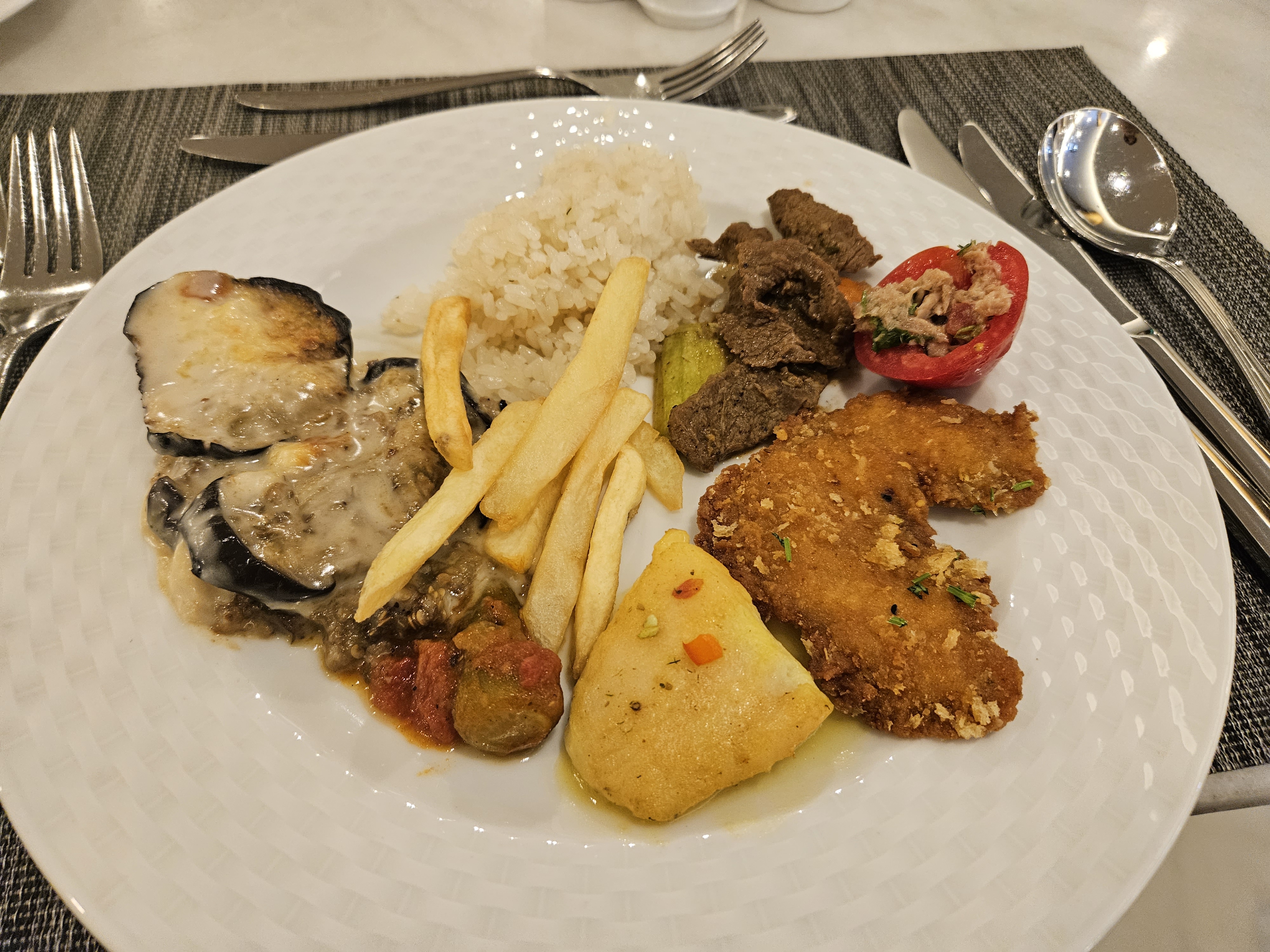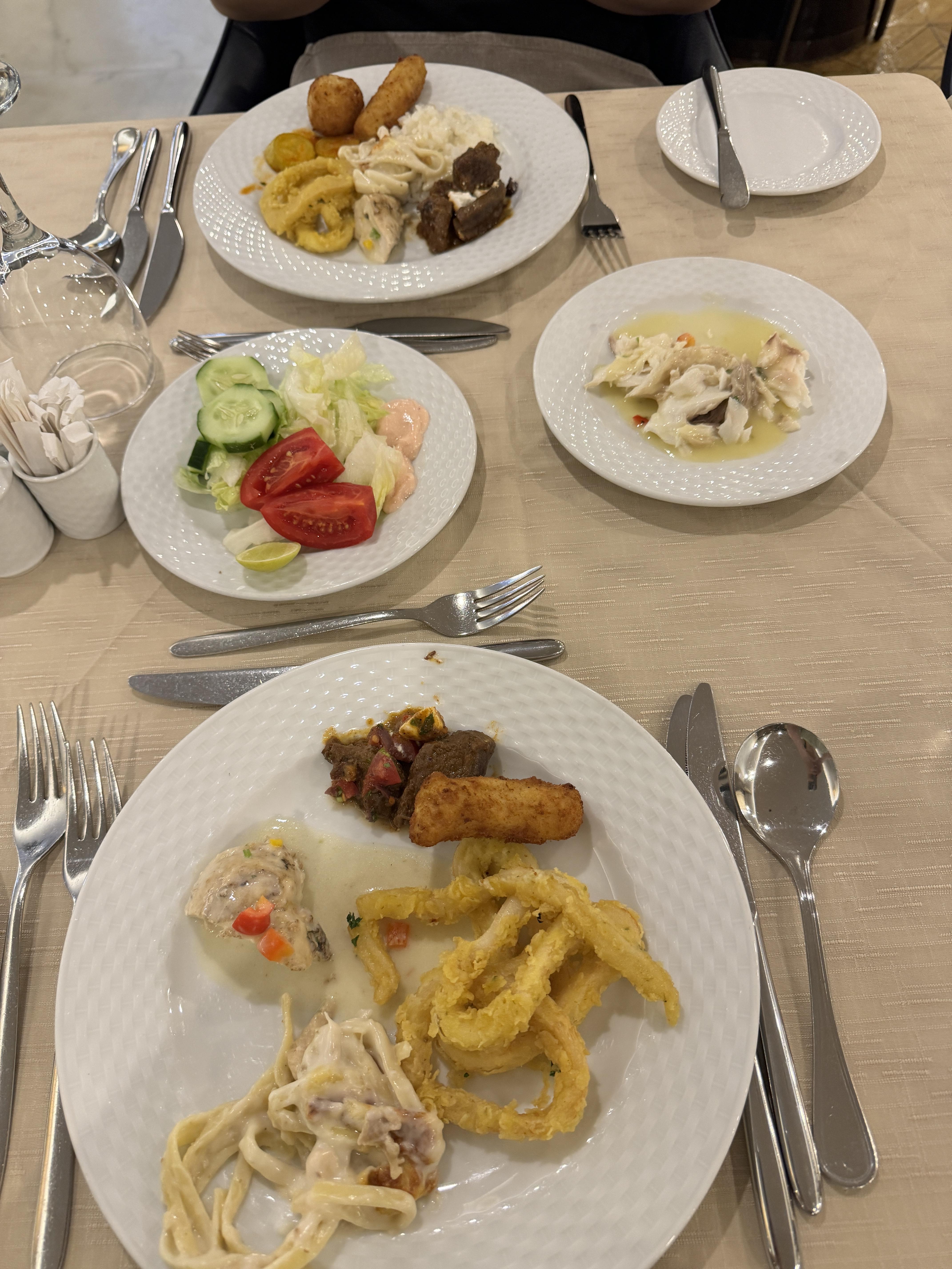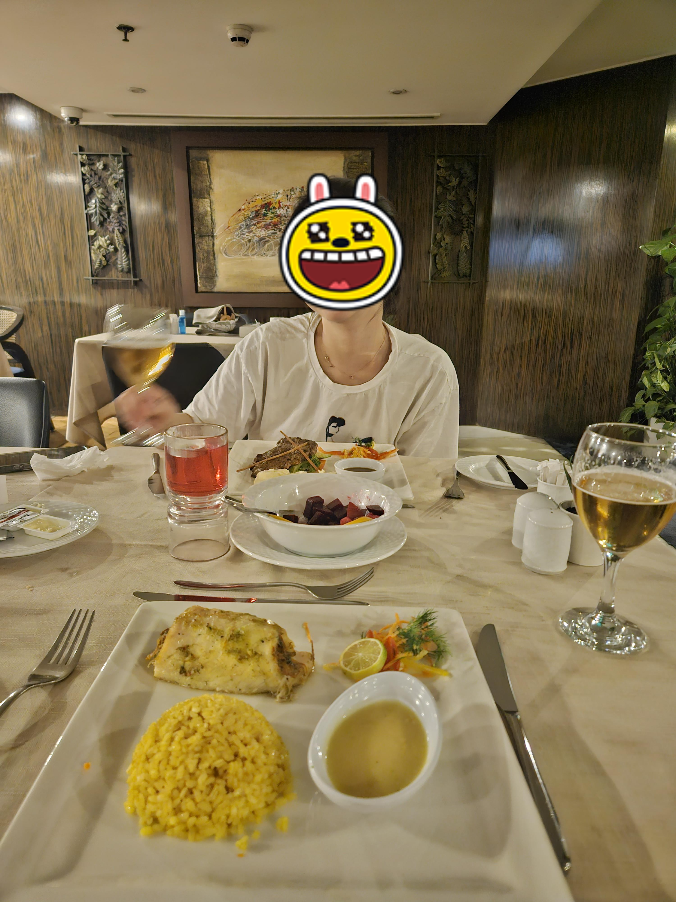 승선하자마자 점심식사를 먹었다. 크루즈 진행하는 내내 같은 자리를 이용해야 하는데 우리가 배정받은 자리는 2인이라 그런지 창가 자리가 아니라서 조금 아쉬웠다. 나오는 음식들은 제일 비싼 배인 히스토리아의 음식들보다는 별로이긴 했지만 흔히들 볼 수 있는 유튜브나 블로그의 음식들보다는 퀄리티가 훌륭했다.
