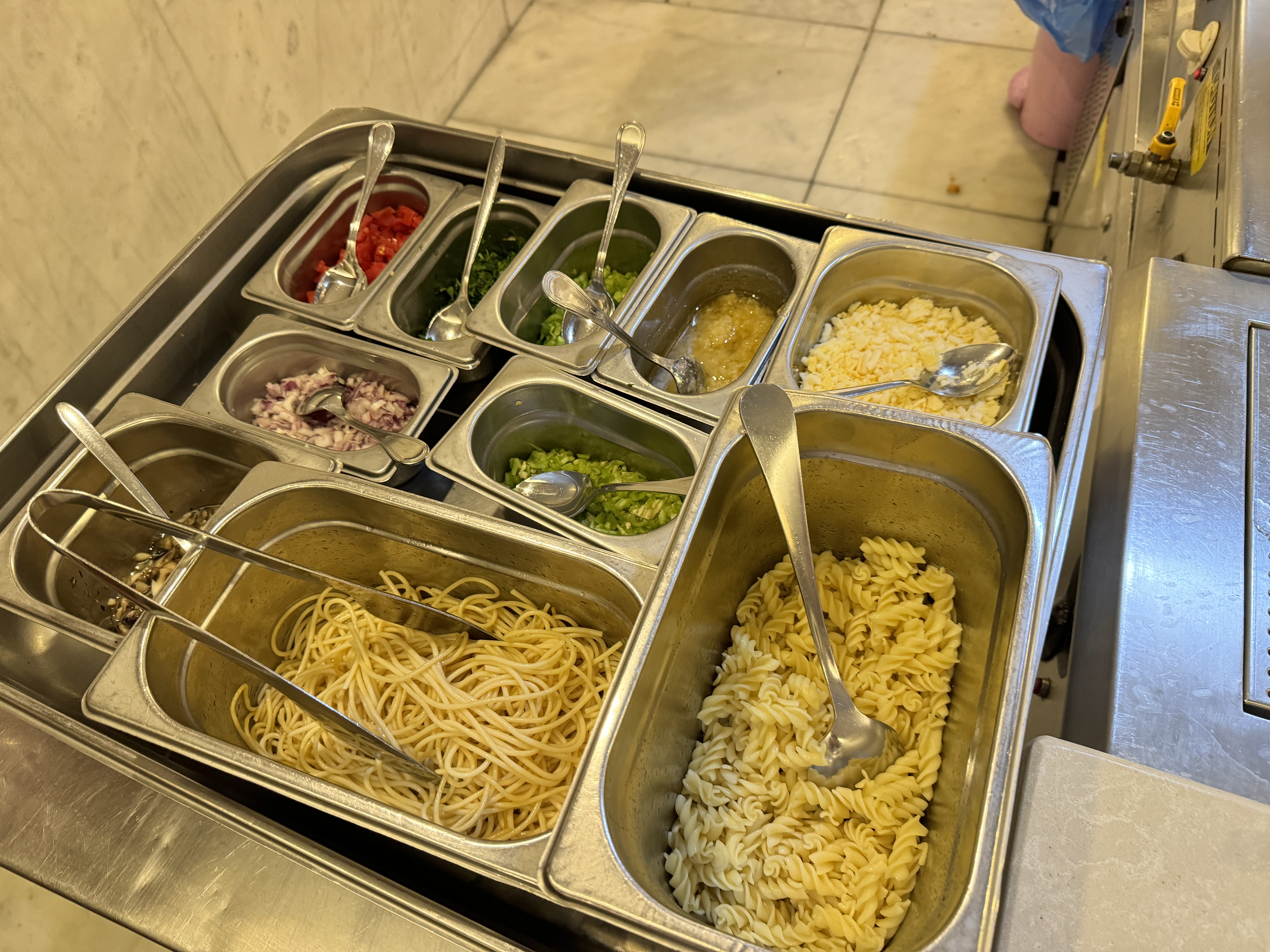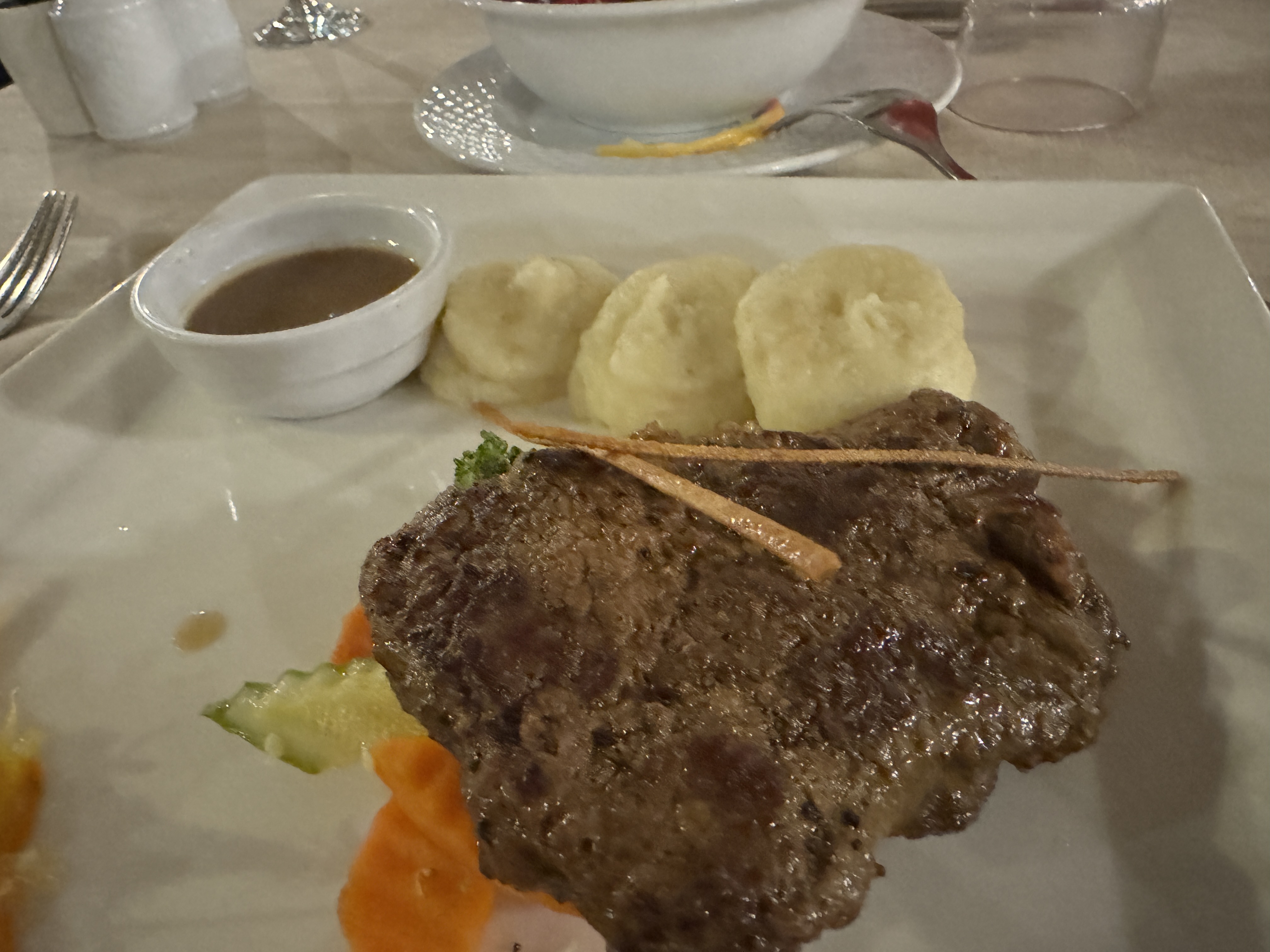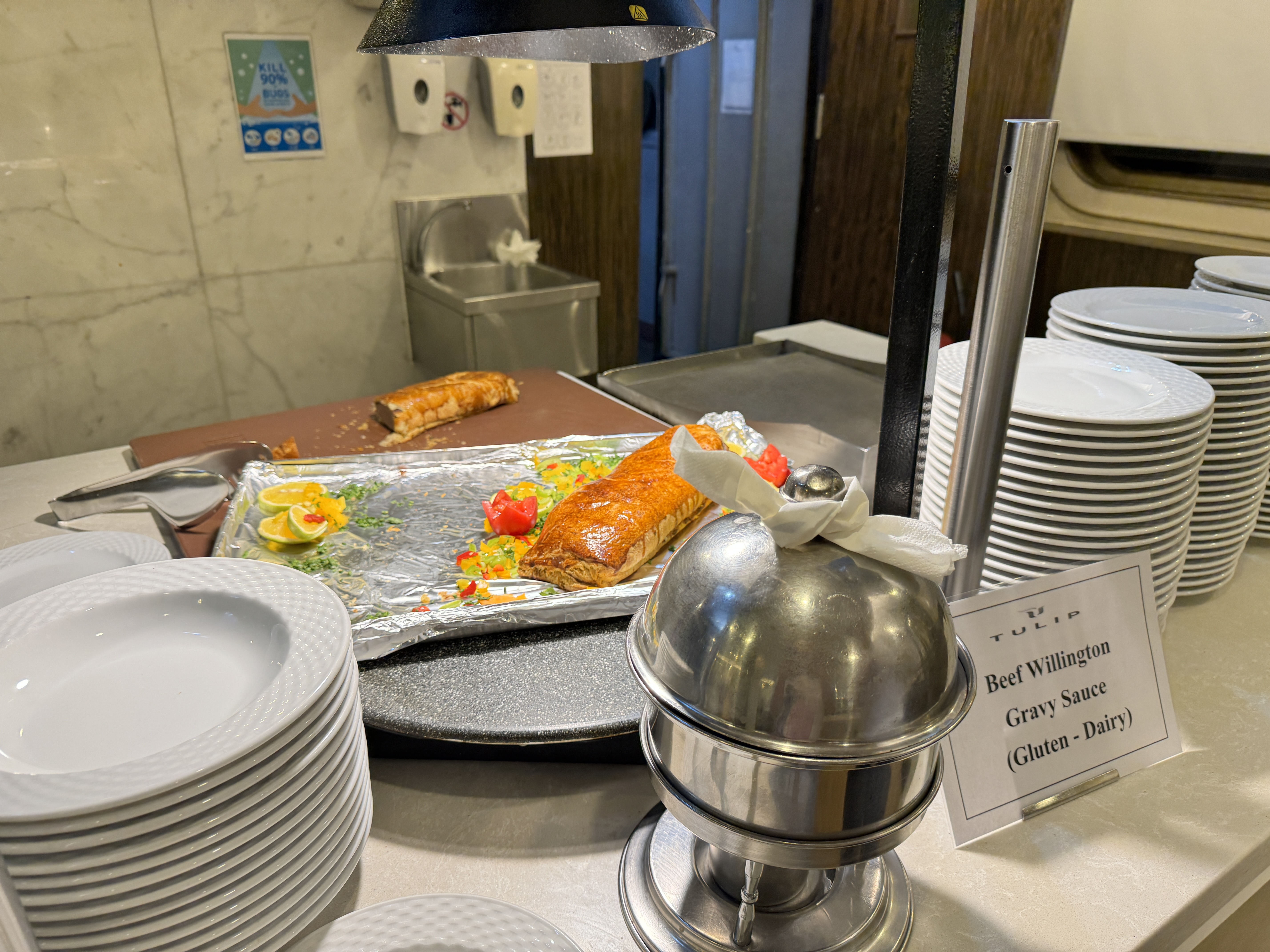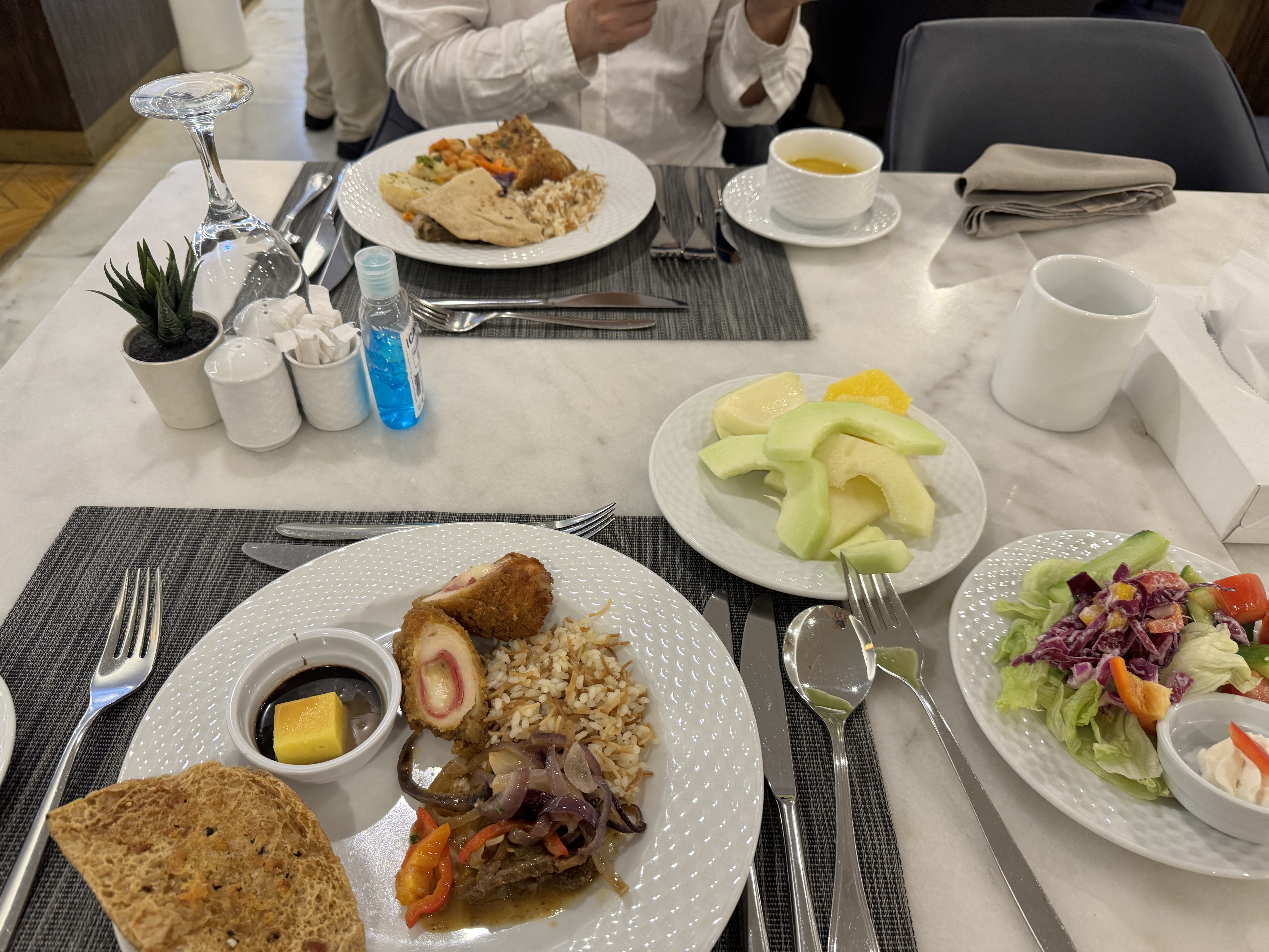 승선하자마자 점심식사를 먹었다. 크루즈 진행하는 내내 같은 자리를 이용해야 하는데 우리가 배정받은 자리는 2인이라 그런지 창가 자리가 아니라서 조금 아쉬웠다. 나오는 음식들은 제일 비싼 배인 히스토리아의 음식들보다는 별로이긴 했지만 흔히들 볼 수 있는 유튜브나 블로그의 음식들보다는 퀄리티가 훌륭했다.