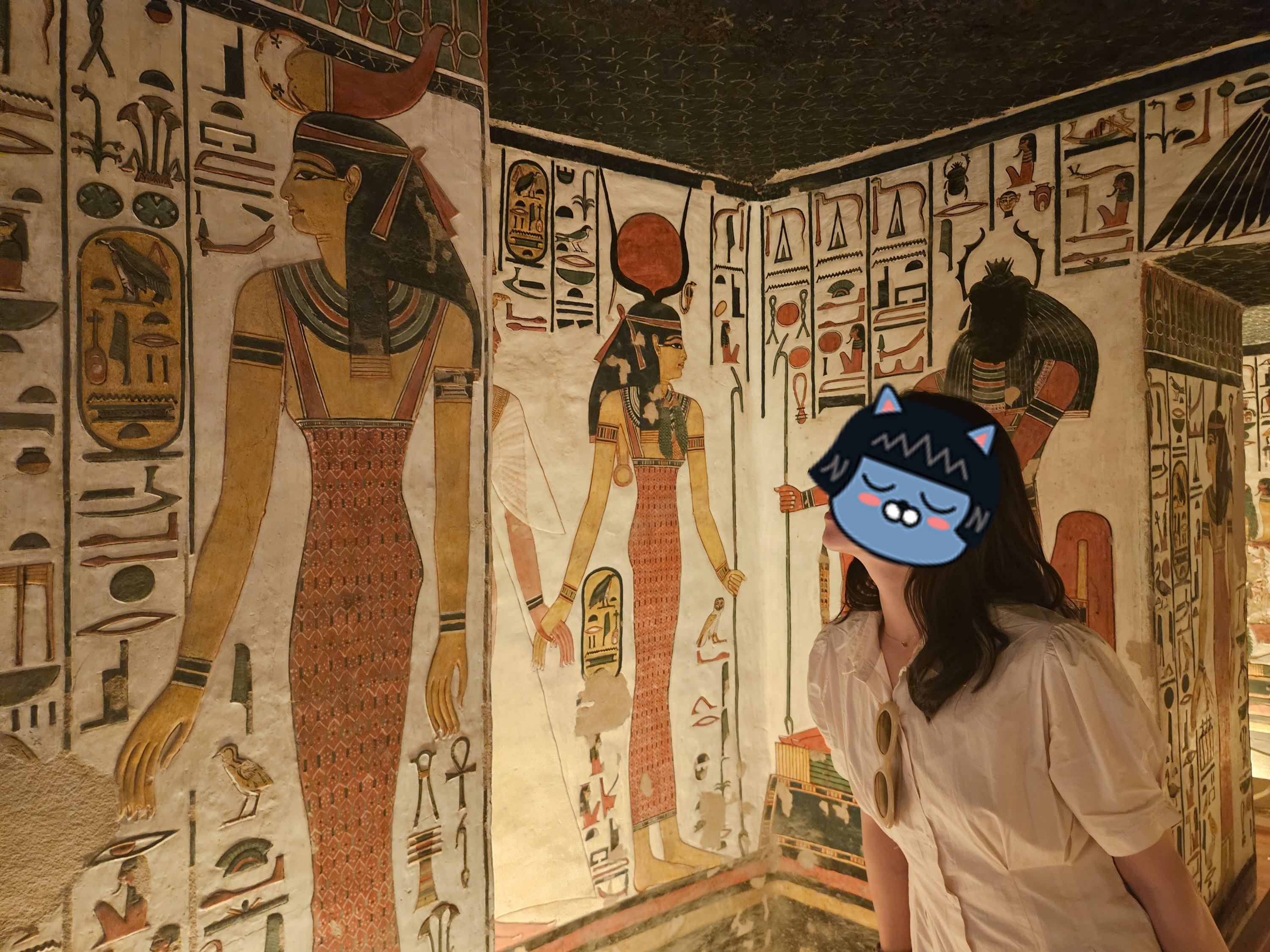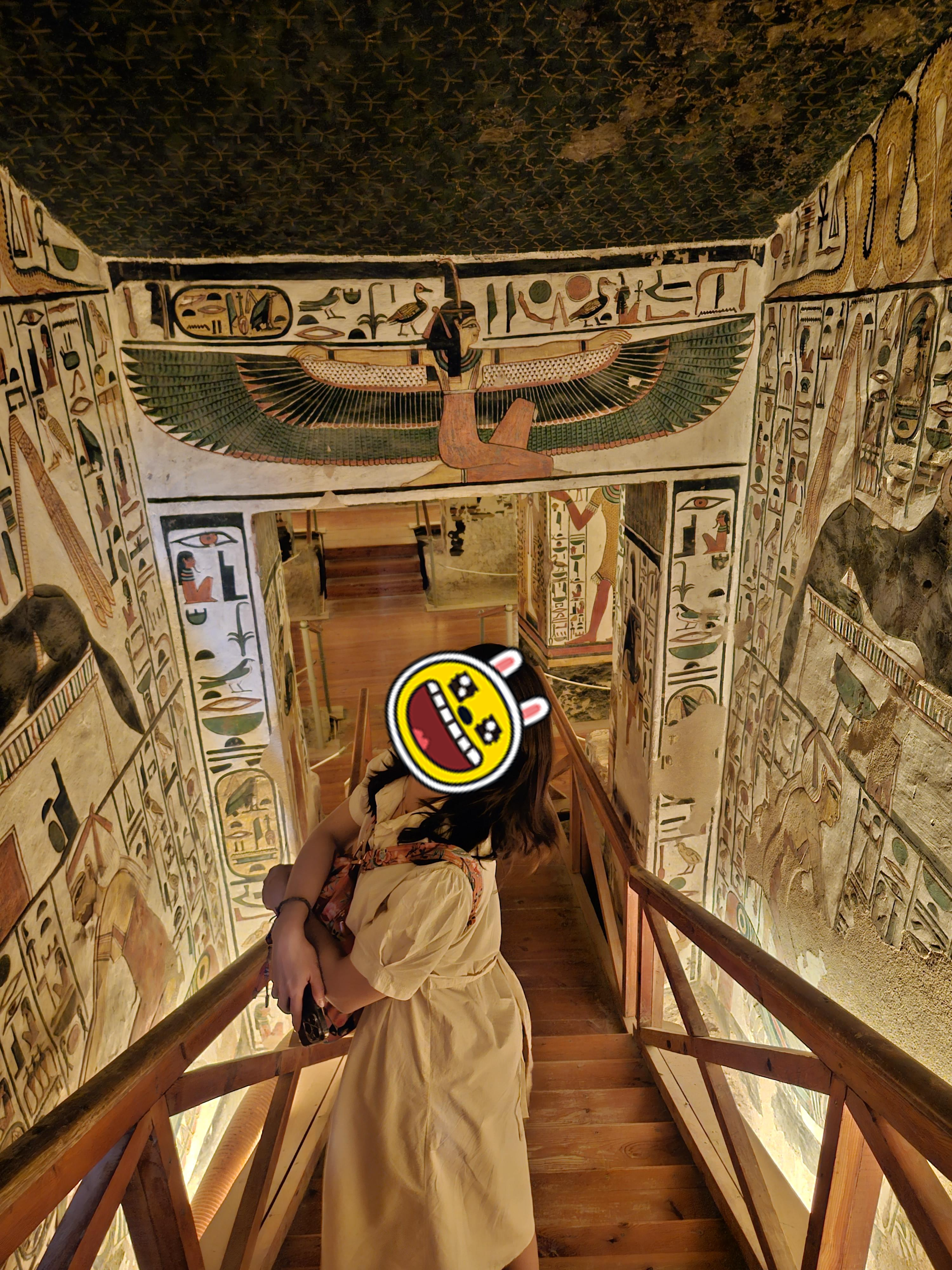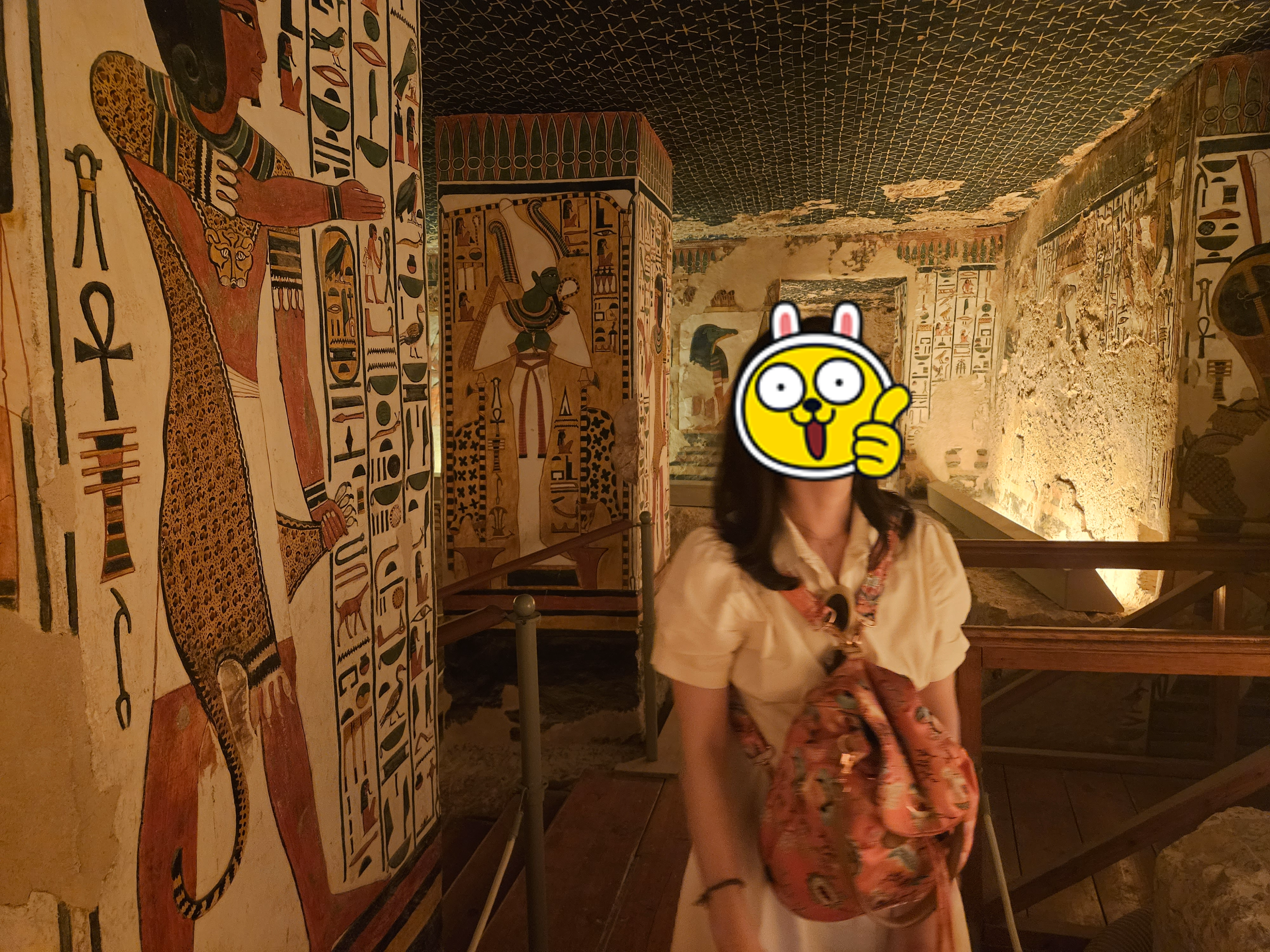 관광객이 들어가 볼 수 있는 무덤 중 색깔 보존이 가장 잘 되어있어 가장 화려한 무덤인 네페르타리 무덤이 사실상 서안계곡의 메인이라고도 할 수 있는데 아무르 가이드 설명과 함께 갈 수 있어 너무 좋았다. 마침 단체 패키지팀이 없는 시간대이기도 해서 모든 무덤들이 사람이 별로 없어서 쾌적하게 구경할 수 있었다. 네페르타리 무덤도 원래라면 어마어마한 줄 때문에 보기 힘들다고 했는데 우리가 갔을 땐 거의 전세내고 둘만 돌아다녔다. 마침 무덤 관리인과 아무르 가이드님이 친분도 있으셔서 원래는 10분 제한인데 무제한으로 원하는 만큼 보고 나왔다 ㅎ 아무르 가이드님도 이렇게 사람이 없는 네페르타리 무덤은 처음이었는지 같이 사진을 찍고 돌아다녔다.