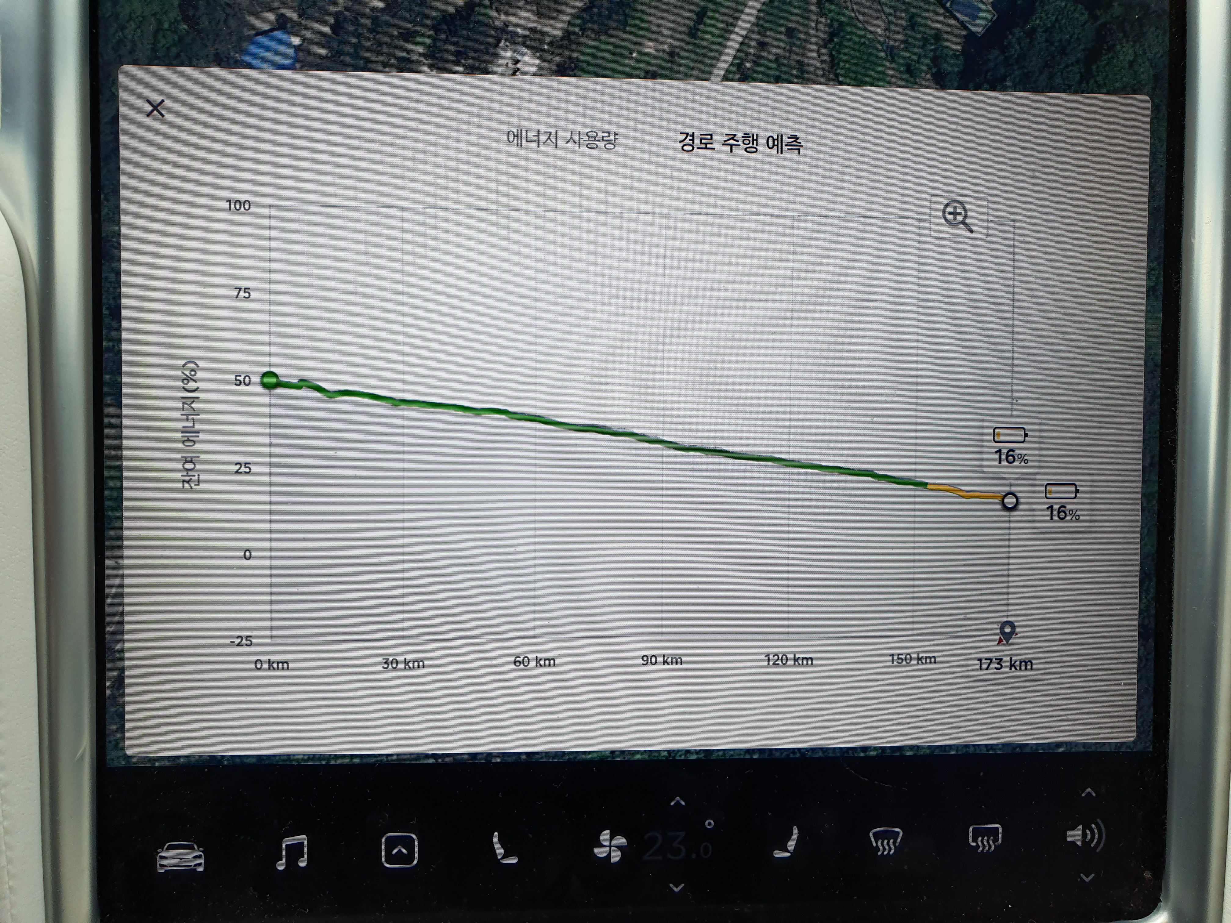 출발시 차량에서 예측한 왕복주행시 남는 배터리량이 아주 정확합니다.