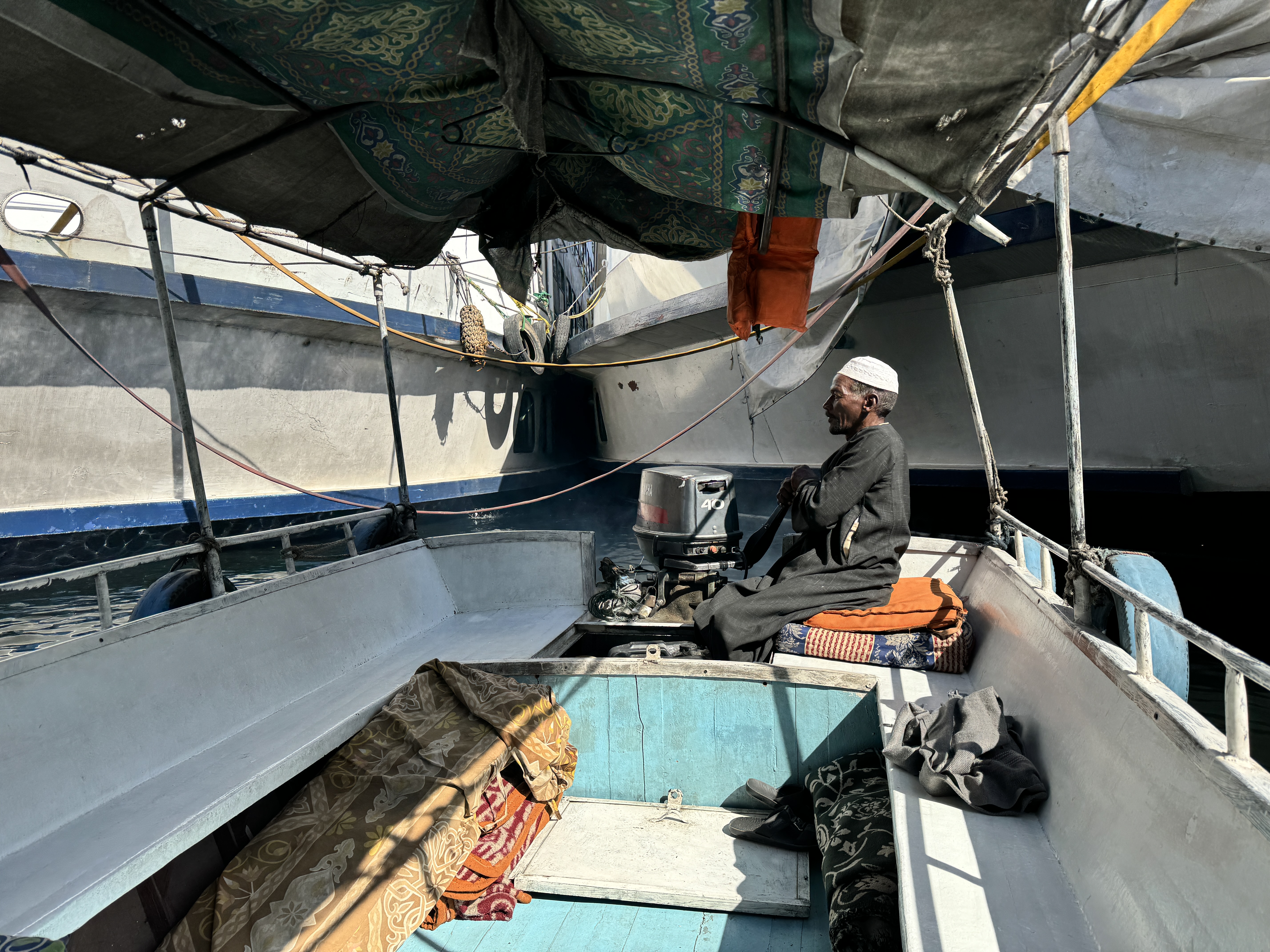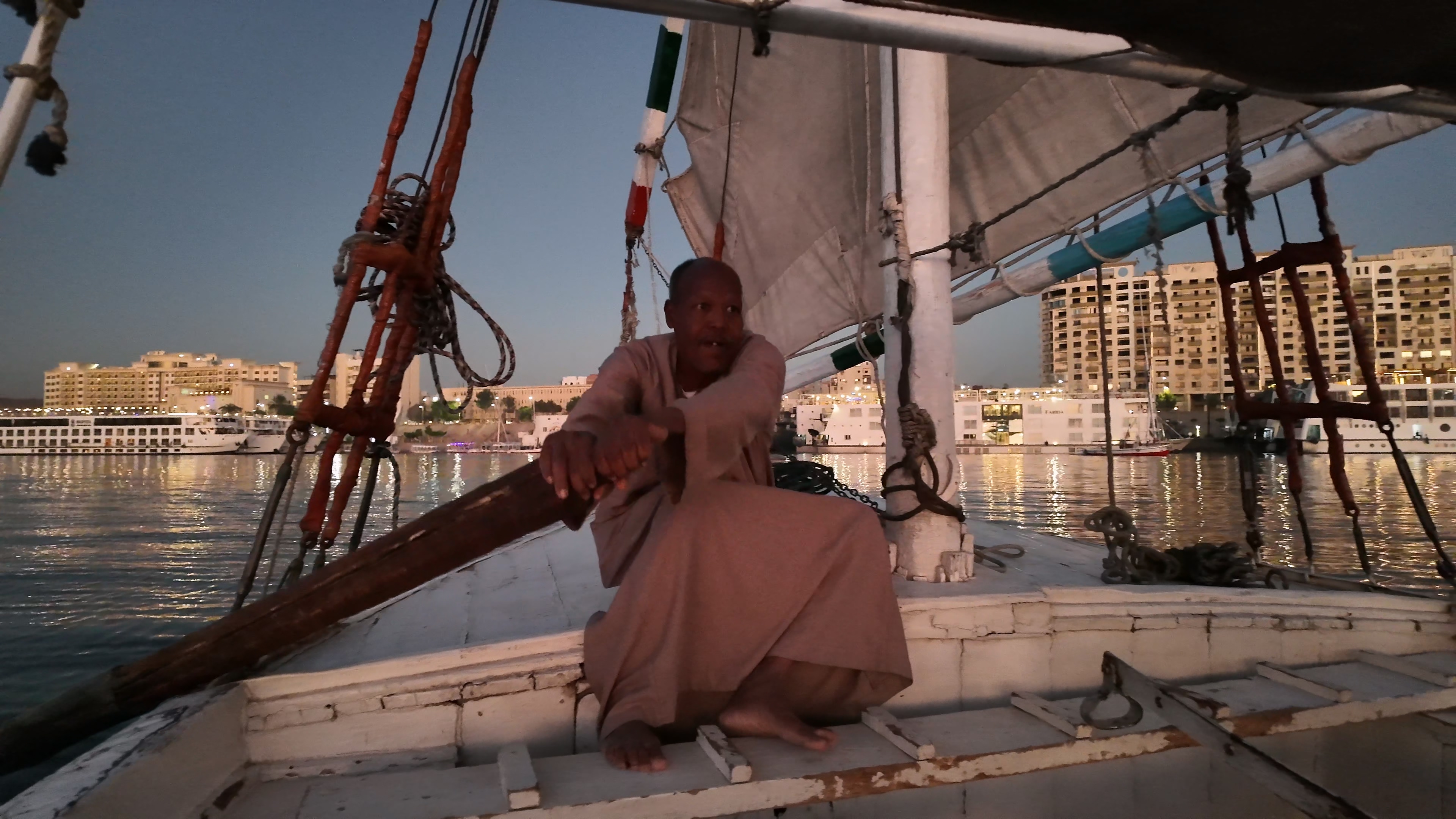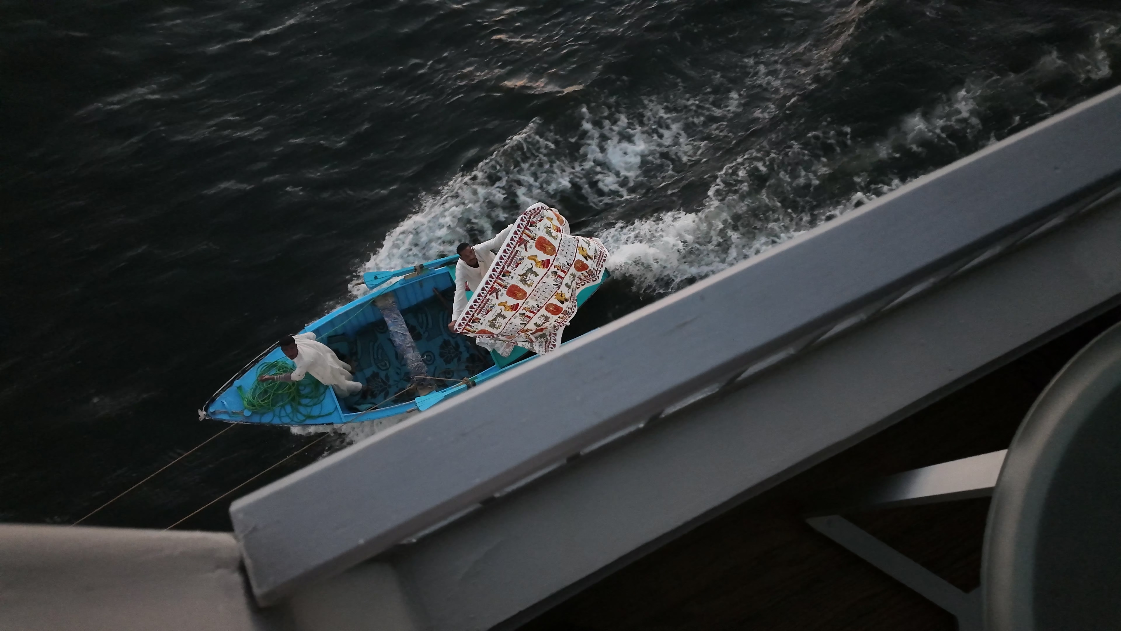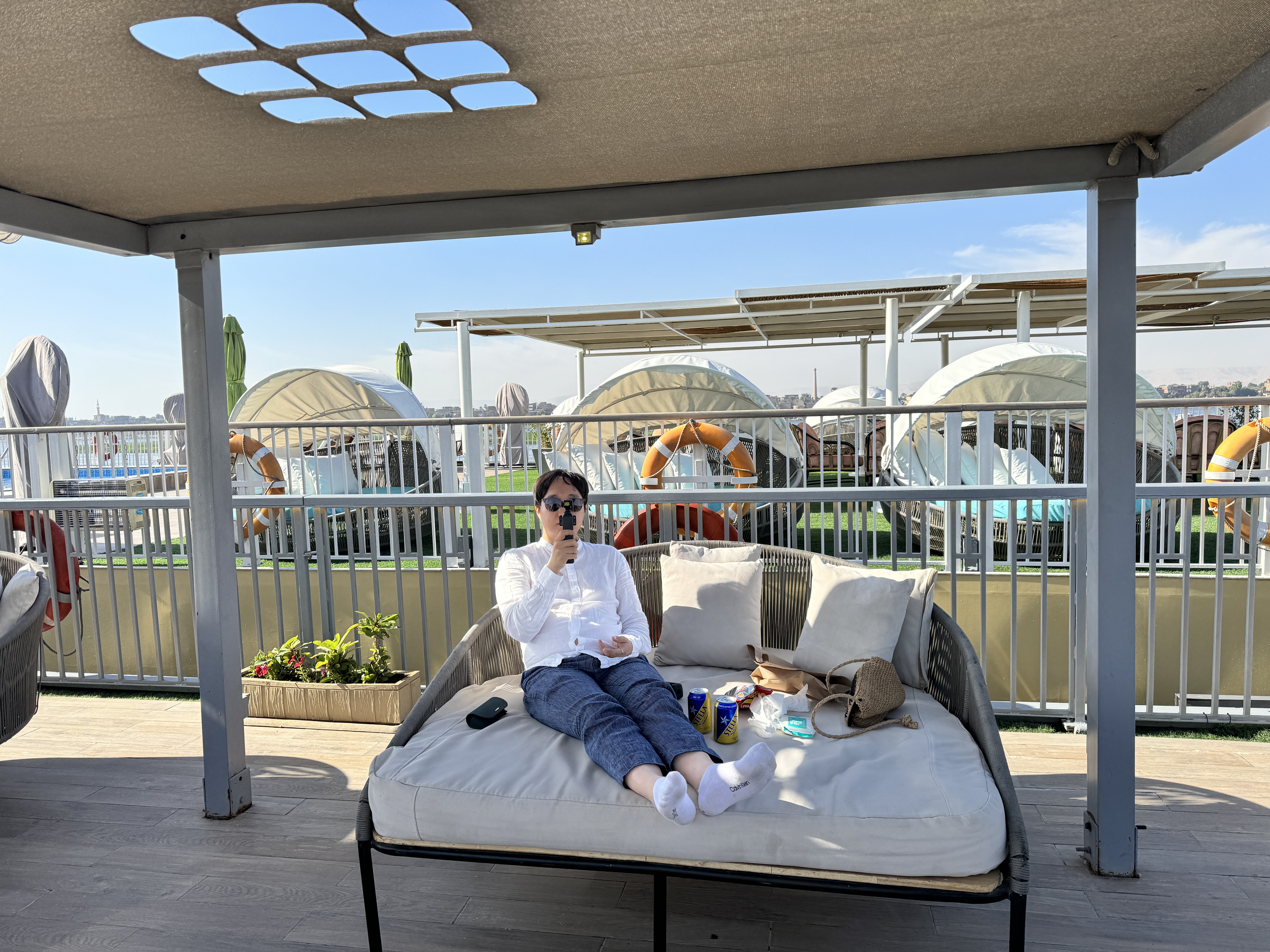 이날 저녁, 크루즈는 에스나를 향해 항해 해 갔고 우리는 테라스에서 노을을 즐기고 있었는데 보트 잡상인이 붙어서는 우리에게 인사를 했다. 유튜브에서 하도 많이 봐서 어그로 끌면 귀찮아진다고 했건만 와이프가 기어이 인사를 받아줬고 역시나 저퀄리티의 직물을 우리에게 던졌다. 안 산다고 다시 던지려고 하니 물에 빠지면 책임질 거냐며 던지지 말란다. 자기네들 배 붙이면 던지라고 하면서 계속 가격 협상만 하려고 해서 둘 다 곤란해졌다.