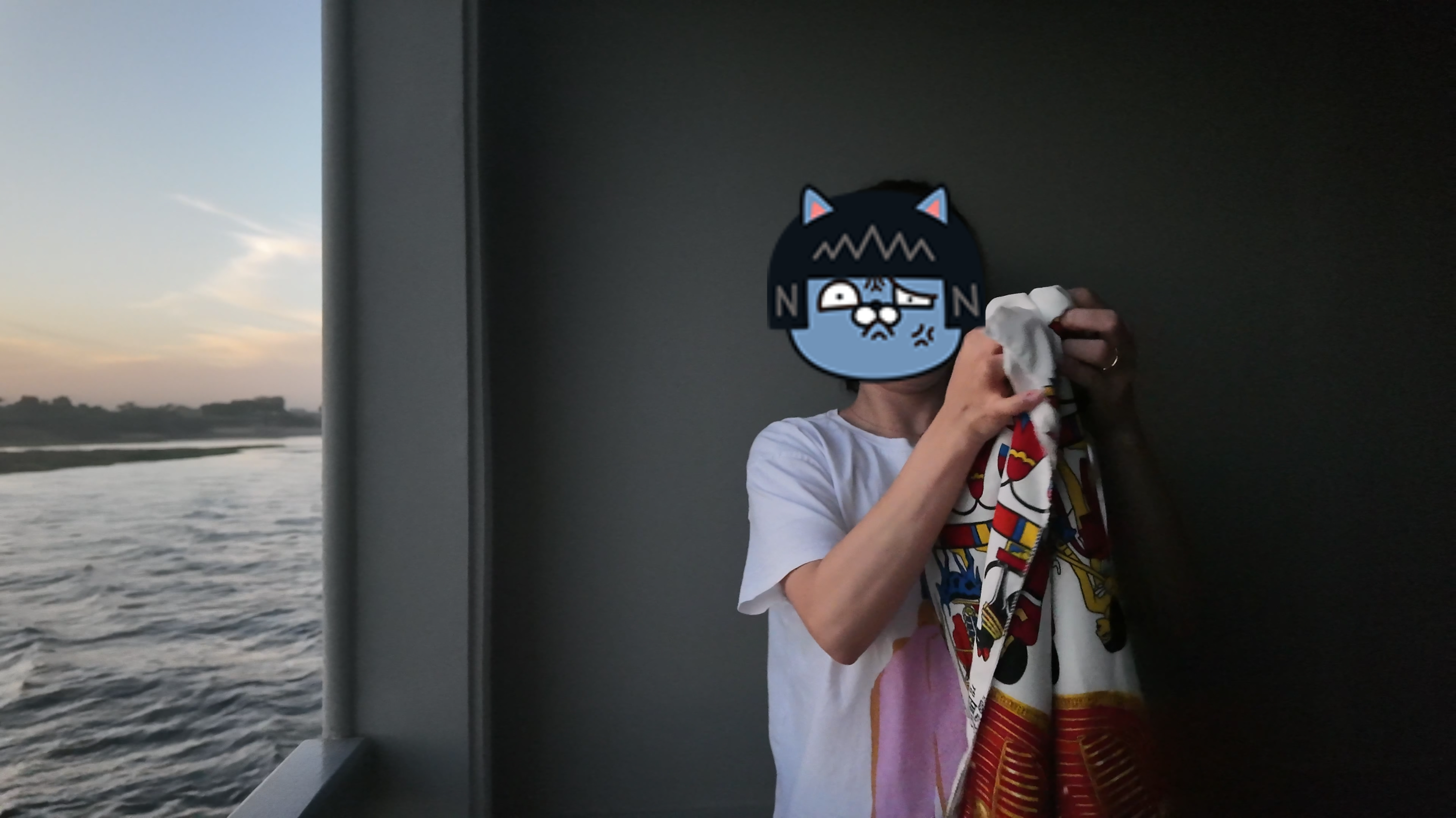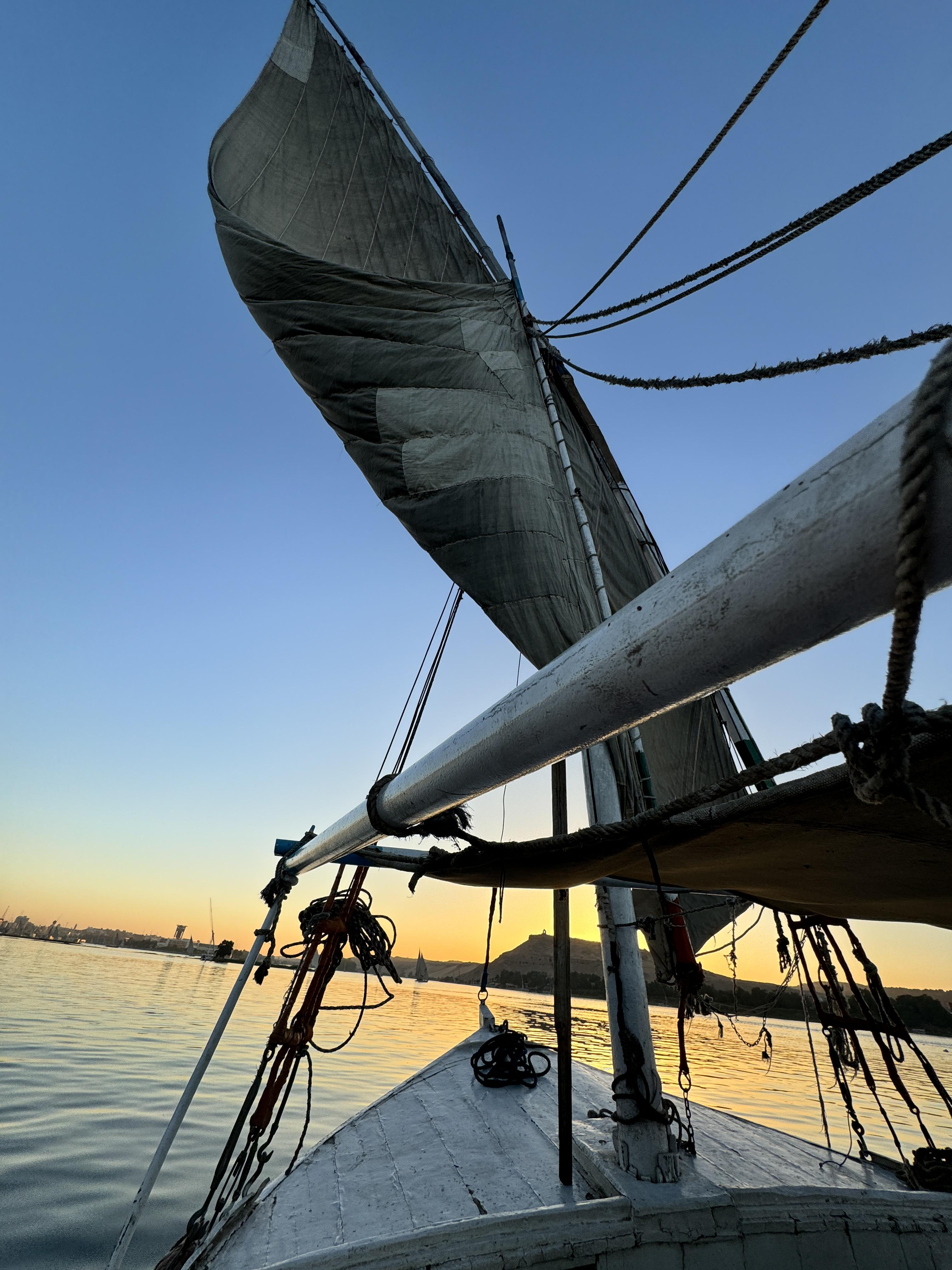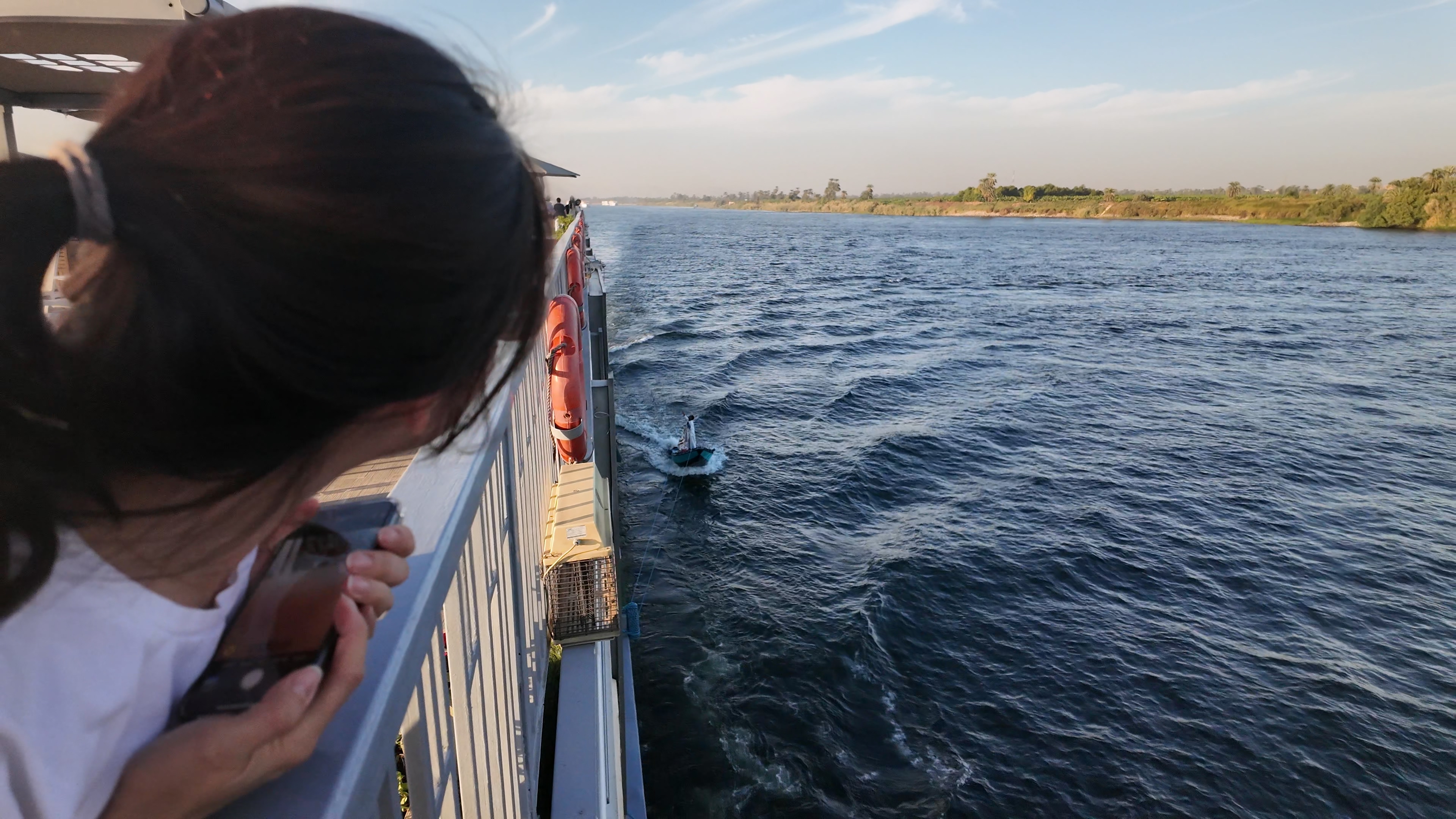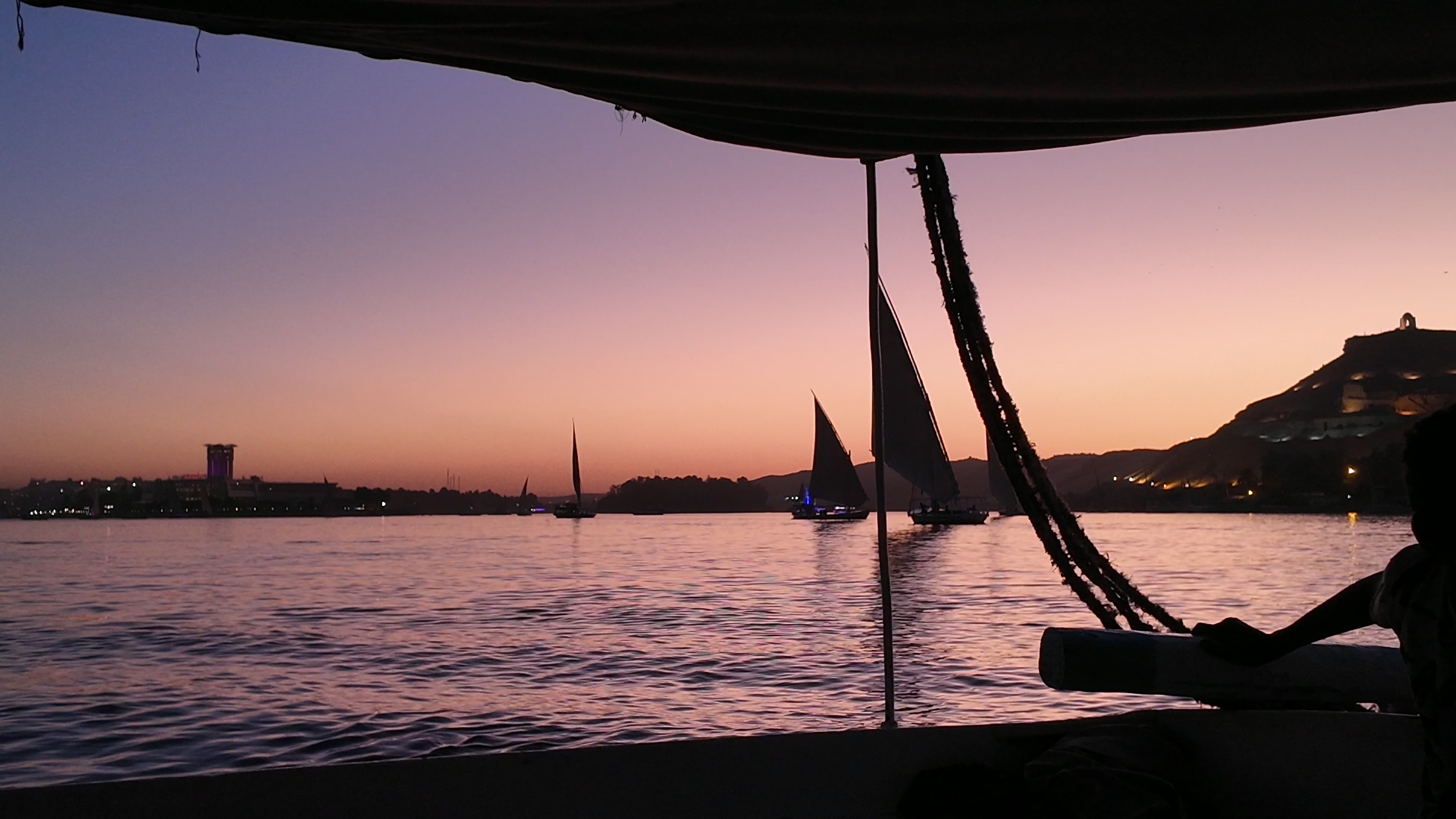 이날 저녁, 크루즈는 에스나를 향해 항해 해 갔고 우리는 테라스에서 노을을 즐기고 있었는데 보트 잡상인이 붙어서는 우리에게 인사를 했다. 유튜브에서 하도 많이 봐서 어그로 끌면 귀찮아진다고 했건만 와이프가 기어이 인사를 받아줬고 역시나 저퀄리티의 직물을 우리에게 던졌다. 안 산다고 다시 던지려고 하니 물에 빠지면 책임질 거냐며 던지지 말란다. 자기네들 배 붙이면 던지라고 하면서 계속 가격 협상만 하려고 해서 둘 다 곤란해졌다.