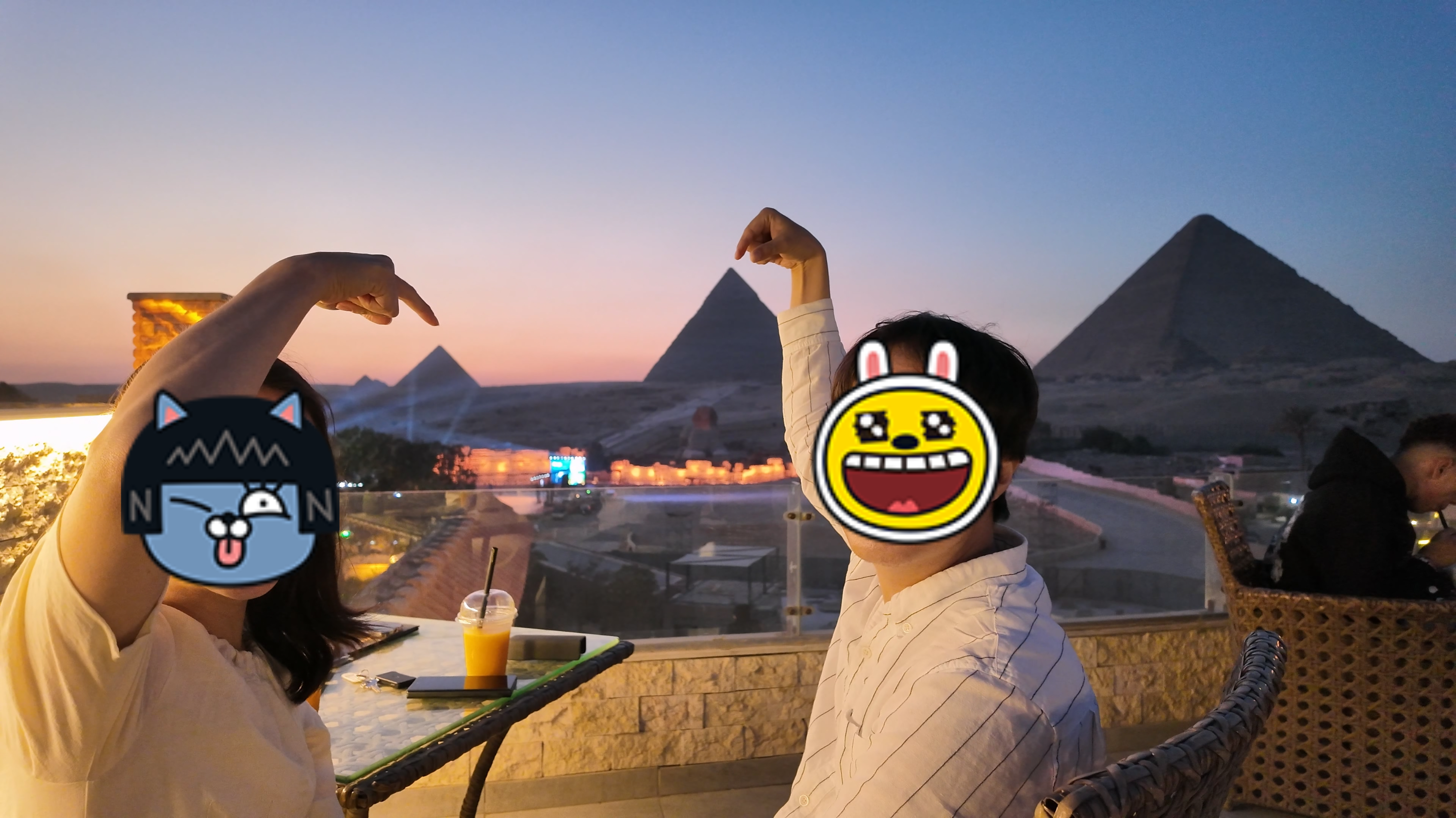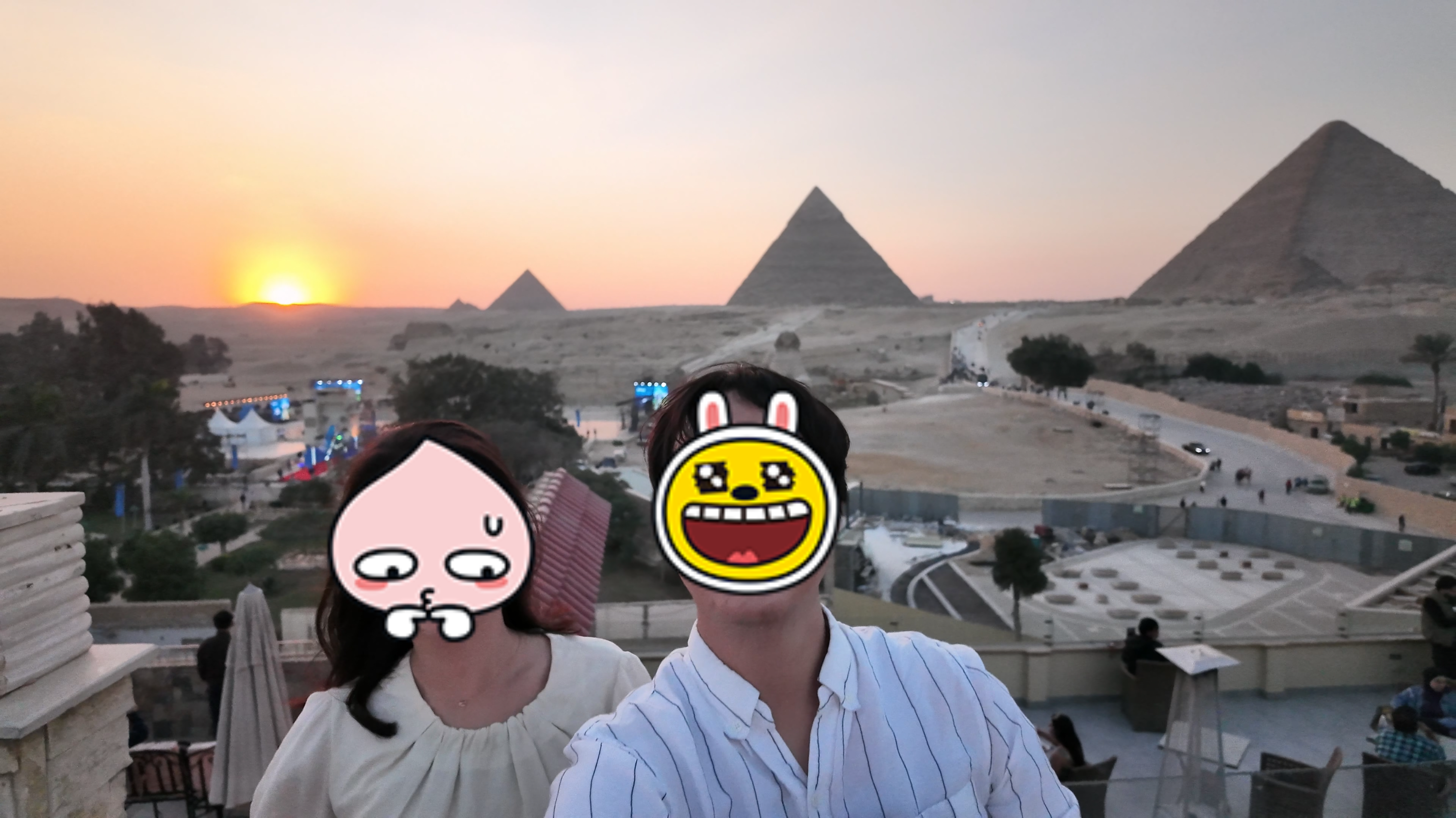 와이프는 아직 피라미드 입장이 가능한 시간이었지만 얼마 안 남은 시간에 사진을 어떻게 찍냐며 돈 아깝다고 안 들어가도 된다며 계속해서 삐져 있었다. 그래서 호텔 루프탑으로 데려가서 석양 속 피라미드 사진을 오지게 찍어 주고 기분을 풀어줬다.