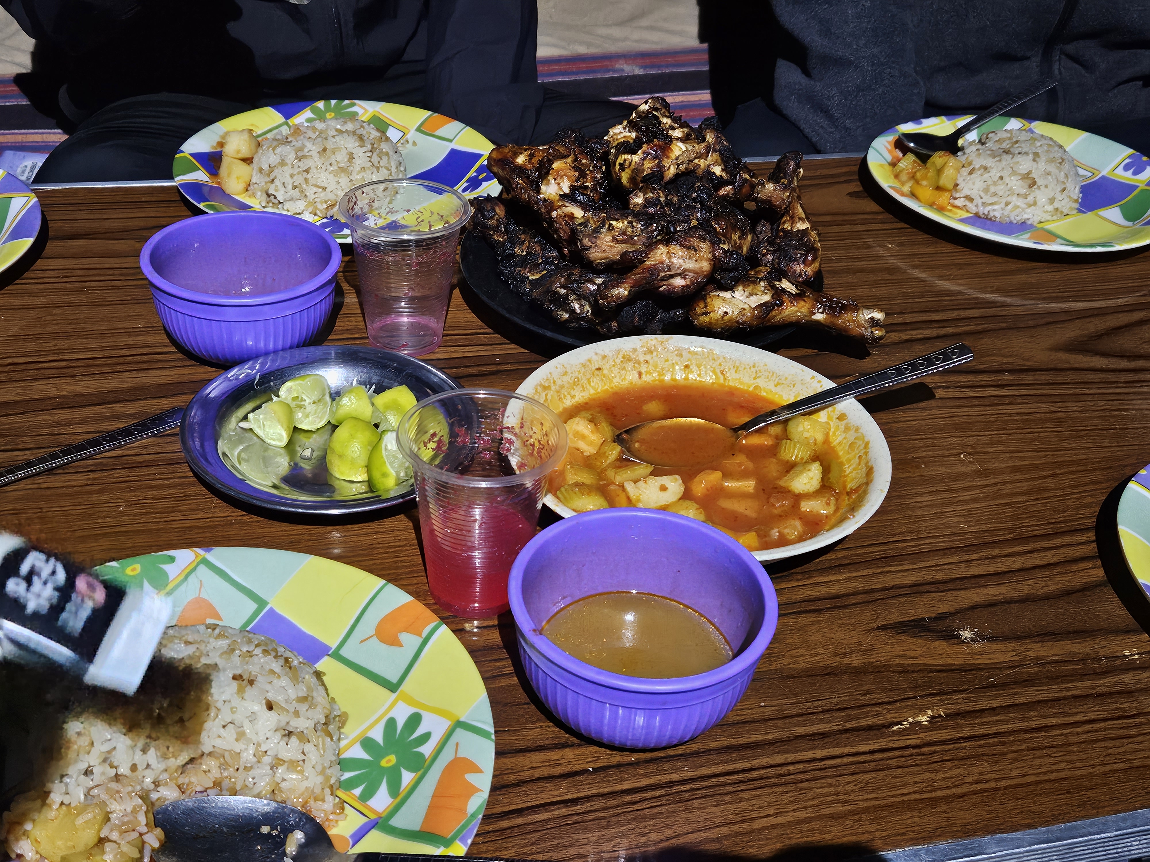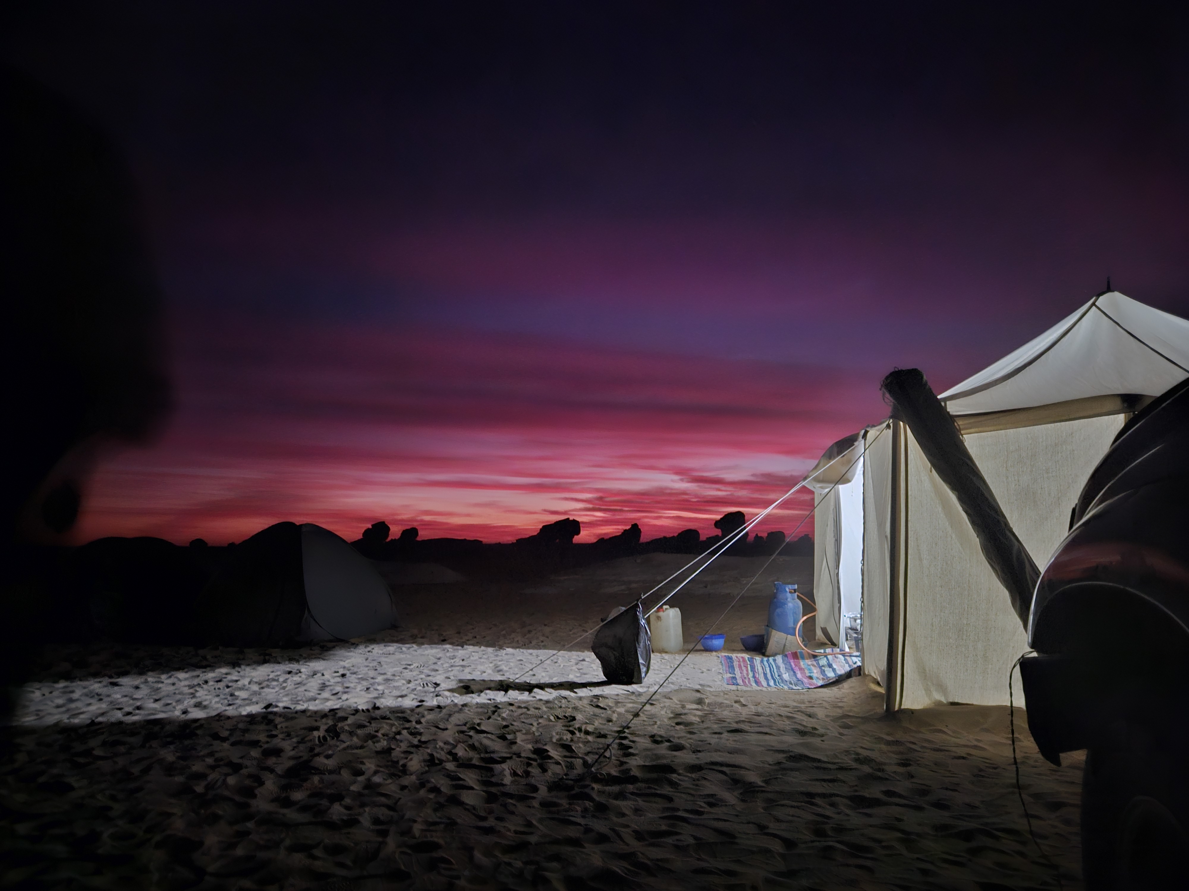 저녁은 배두인 운전자분이 직화로 구워주는 소고기 닭고기 바베큐. 이집트 스프와 밥이랑 같이 먹었다. 사진에선 겁나 타 보이는데 그래도 존마탱! 소고기가 엄청 맛있었는데 추가는 불가능했다 ㅎ 일행분께서 양주를 찬조해 주셔서 양주랑 슈웹스랑 섞어 마셨다.