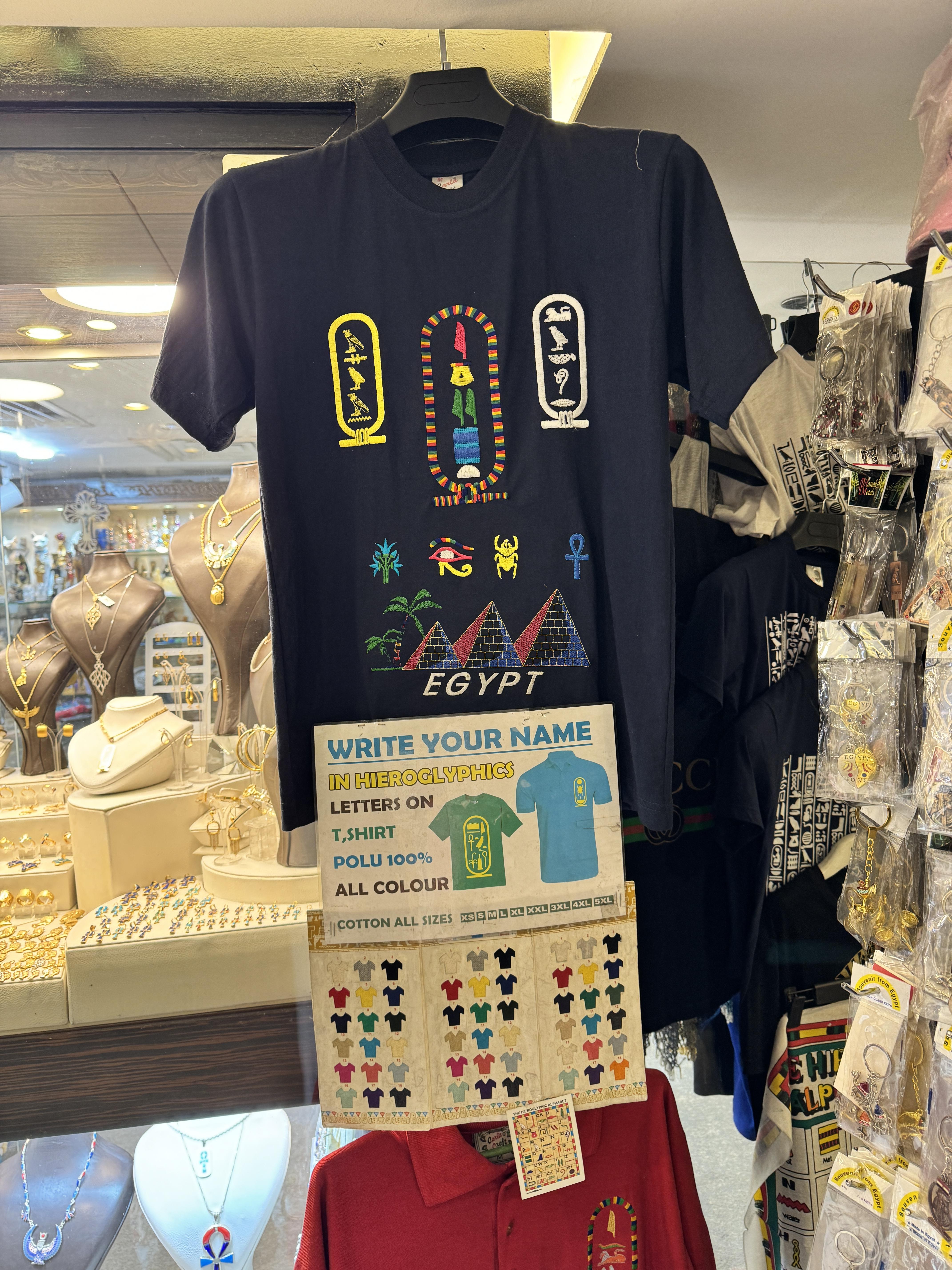 크루즈 2층에는 기념품샵이 있었는데 상형문자로 자기 이름을 써주는 티셔츠를 20달러에 구매했다. 그리고 와이프는 웬일로 파라오 티셔츠를 구매했다. 2개 같이 사는 거니 깎아달라고 해서 15달러짜리를 10달러에 샀다. 이집트 물가 치고는 비쌀 텐데 그래도 크루즈에 입점한 곳이라 그런지 호객행위를 안 해서 물건 구경하기가 좋아서 그냥 여기서 샀다.